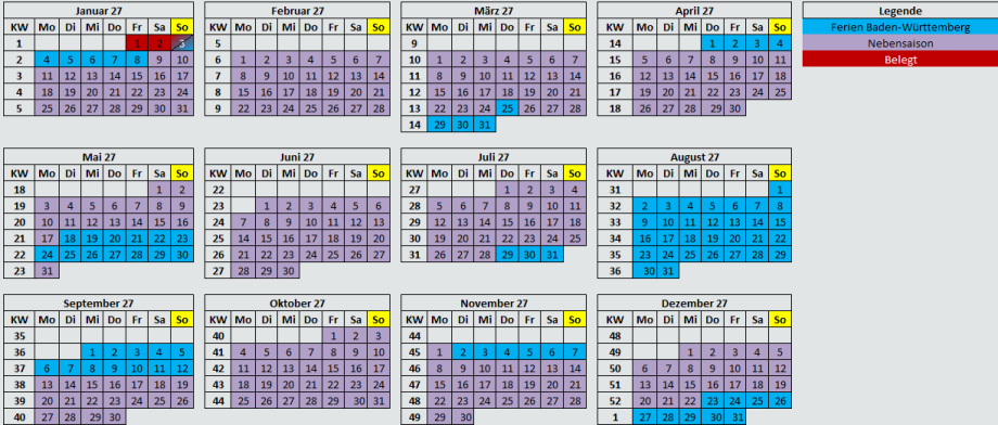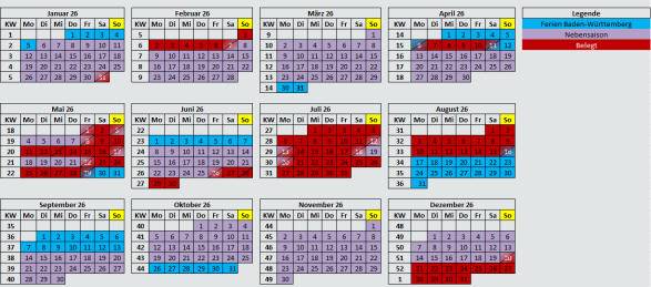 Den Saisonkalender sowie die Ferienzeiten finden Sie weiter unten!