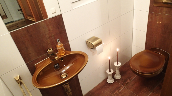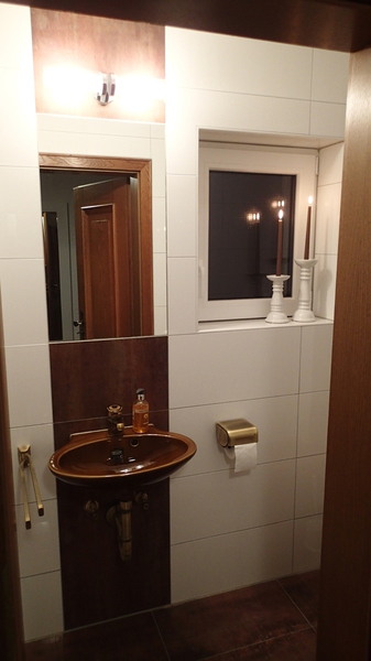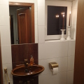 Das separate Gäste-WC geht vom Flur ab, ist mit Designerleuchten und Fenster ausgestattet und bietet zusätzlichen Komfort.