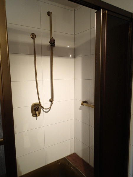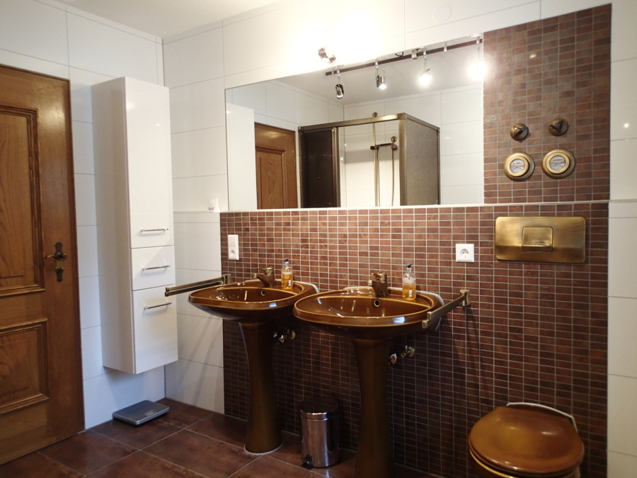 Das Bad ist ausgestattet mit einer großen Dusche, 2 Waschbecken und edlem Feinsteinzeug