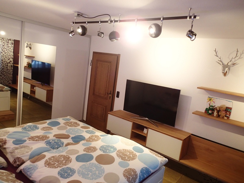 Das geräumige Schlafzimmer ist ausgestattet mit einem hohen Designer-Doppelbett in Weisslack-hochglanz und einem riesigen 55 Zoll Flatscreen mit HD Sat-TV. Integriert ist ein Soundmodul mit Bluetooth-Anbindung für Ihre Musik z.B. über Ihr eigenes Smartphone.